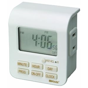 Product Description : Woods 50008 Indoor 7-Day Digital Outlet Timer. Large Easy-to-read LCD display. Programmable timer settings repeat every week on a 7-day cycle. Up to 20 on/off settings per day -repeats weekly. Works with lamps, fans, and other 2-prong(conductor) appliances. Options to program each day different or weekdays different than weekends. self recharging stores programs when you remove from an outlet, . Woods is a subsidiary of Coleman Cable, Inc. French and Spanish instructions also included. 125-Volt AC, 60Hertz Resistive rating:10A, 1250-Watt. Tungsten rating:4A, 500-Watt. 4A Ballast.